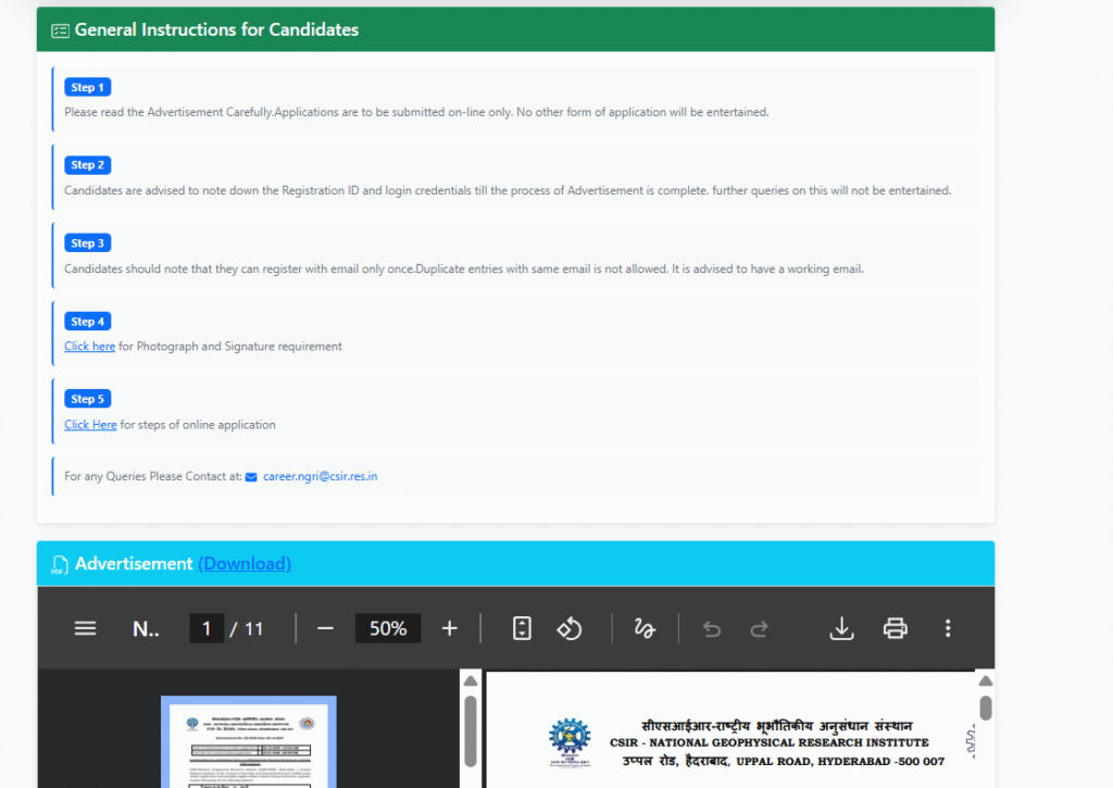 CSIR – నేషనల్ జియోఫిజికల్ రీసెర్చ్ ఇన్స్టిట్యూట్ (NGRI), హైదరాబాద్ సంస్థలో Multi-Tasking Staff (MTS) పోస్టుల కోసం apply చేసే అభ్యర్థులు ఆన్ లైన్ లో అప్లికేషన్ ను fill చేసి ఆన్లైన్ విధానంలో ఫీజు చెల్లించవలసి ఉంటుంది.