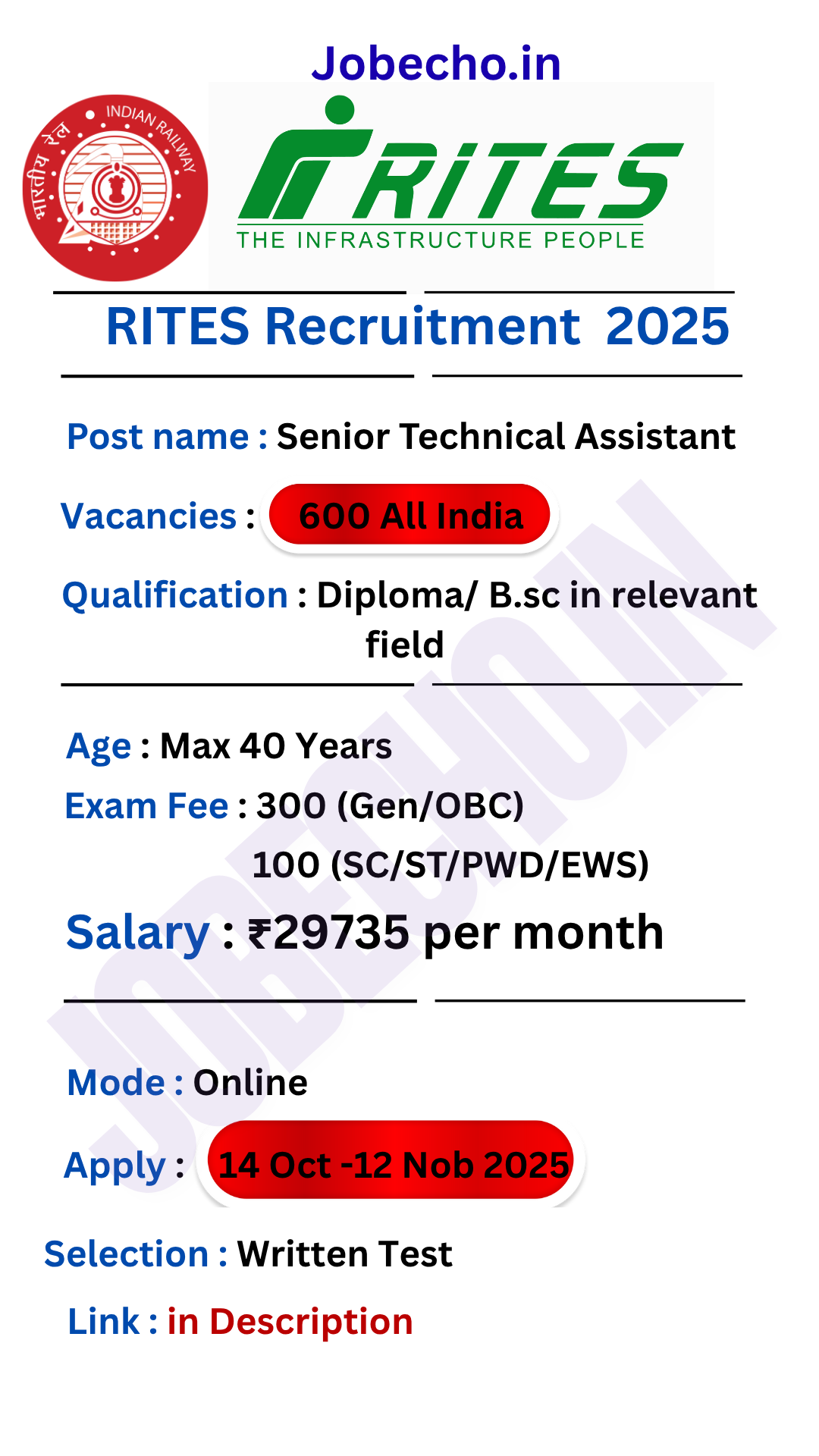 RITES Limited (భారత రైల్వే మంత్రిత్వ శాఖకి చెందిన ప్రభుత్వ సంస్థ), ఇది ఇంజనీరింగ్ మరియు కన్సల్టెన్సీ సేవలను అందిస్తుంది, ముఖ్యంగా రవాణా మౌలిక సదుపాయాలను అందిస్తుంది. ఈ సంస్థ నందు Senior Technical Assistant పోస్టు కోసం నోటిఫికేషన్ release అయ్యింది. ఇందులో దేశ వ్యాప్తంగా 600 పోస్టులకు ఖాళీలు ఉన్నాయి.ఈ జాబ్ కోసం 14 అక్టోబర్ నుంచి 12 నవంబర్ 2025 వరకు ఆన్‌లైన్‌లో దరఖాస్తును అంగీకరించబడతాయి.ఇందులో సెలెక్ట్ అయిన వారికి 29735/- నెల జీతం అనేది ఇవ్వడం జరుగుతుంది.దీనికోసం B.Sc./Diploma చేసిన 18- 40 సంవత్సరాల వయస్సు గలవారు అర్హులు.